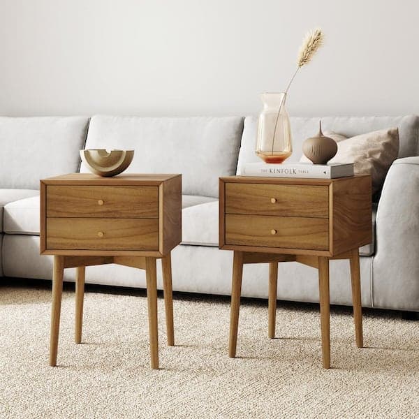 Harper 16 in. Mid-Century Oak Wood Nightstand with 2-Drawers, Small Side or End Table with Storage, Brown, Set of 2