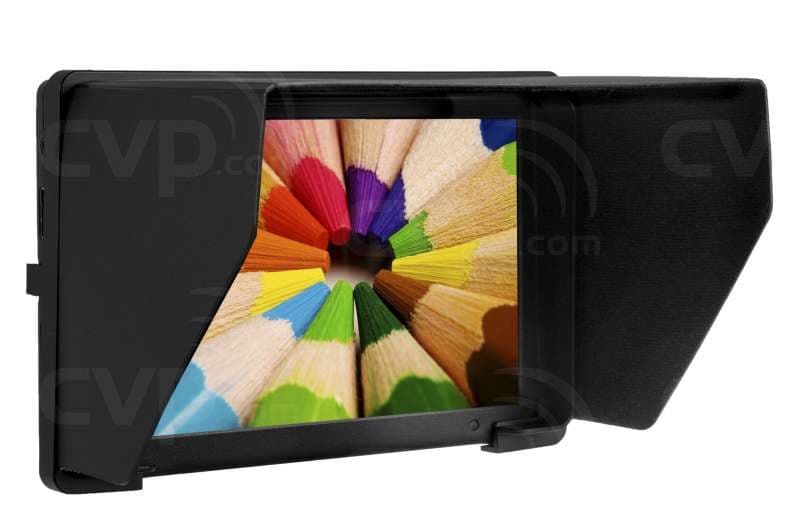 Compact 7" Full HD (1920x1080) IPS on-camera reference monitor with HDMI input/output, 450 cd/m² brightness, 1200:1 contrast, focus peaking, false color, zebras, histogram, pixel-to-pixel zoom, anamorphic de-squeeze and multiple battery plate options. Includes detachable/foldable sun hood, AC/DC adapter (multi-plug), battery brackets (NP-F/LP-E6/BP-U), shoe-mount ball head and HDMI cable.