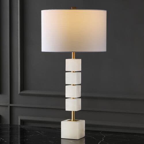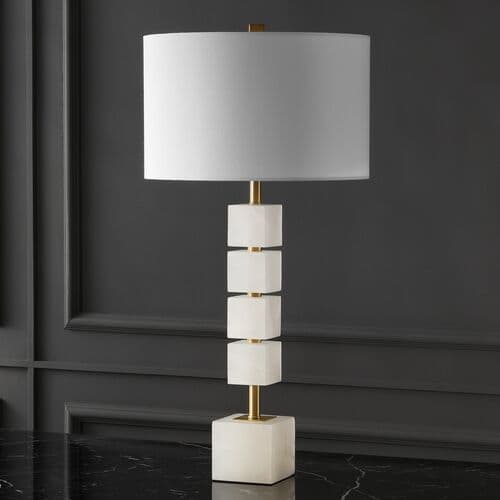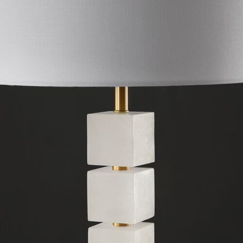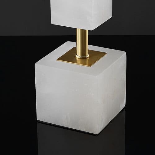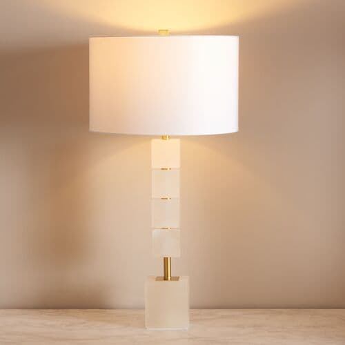 Statuesque and spellbinding, this stunning table lamp is an absolute knockout. Four handmade alabaster blocks wrap around a metal post resting atop a fifth cube base, making a decadently dramatic statement in any room. Designers love its modern art vibe.