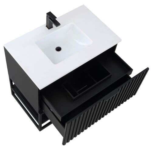 The Terra Bathroom Vanity is a masterpiece of design, featuring a uniquely fluted facade that brings a sleek and bold aesthetic to any bathroom. Crafted with precision, the architectural metal frame is available in a variety of finishes, ensuring a perfect match for your decor. The floor models are thoughtfully designed with an integrated storage shelf that is both durable and functional. Inside, the vanity boasts deep soft-close and interior pullout drawers, all complemented by a matching finish for an easy-to-clean environment. Premium Blum glides ensure effortless motion, while dovetailed joints provide seamless joinery. To complete the unified look, choose from a selection of luxurious tops, including smooth Italian Carrara marble, Calacatta Quartz, or White Quartz. This vanity is a testament to refined craftsmanship and timeless style, making it a stunning addition to any bathroom. (Faucet not included)