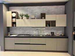 Cucina lineare Net Cucine Zoe in stile moderno e minimalista con ante in finitura Zoe Perla opaco, top laminato colore Samas 3482 (Marmo Nero), elementi a giorno in finitura effetto legno, gole in metallo lava e zoccolo antracite. Composizione con basi, pensili e colonne con elettrodomestici inclusi (piano cottura Electrolux 5 fuochi, forno Electrolux, frigorifero Hotpoint Ariston, lavastoviglie Hotpoint Ariston, cappa Elica, lavello CM 2 vasche e miscelatore Elleci). Prodotto in vendita per rinnovo expo presso Mobili Coia Arredamenti s.r.l.