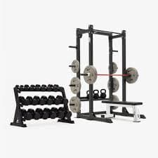 The Victory Home Gym is an all-in-one home gym setup that features Nike Strength's most popular products and includes a turnkey assortment of essentials to transform a garage into a home gym. Sets include a choice of rack (Nike Half Rack, Nike Squat Cage, or Nike Squat Rack - Standard Height), a 5–50 lb dumbbell set + bumper plates (various Nike Grind or Black Rubber options), a choice of 15 kg or 20 kg Nike Strength Shield barbell, and included accessories such as a dumbbell rack, rolling weight bench, barbell collars, and kettlebells. The bundle ships with integrated storage options and premium components described on the product page.