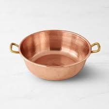 Handcrafted by master coppersmiths in Italy, this Ruffoni Historia hammered copper stock pot (3 1/2-qt.) features a tin-lined interior, riveted cast-bronze handle with sculpted acorn at base and a tin-lined lid topped with a hand-cast bronze olive branch plated in brass. The belly-shaped pot is designed for even heating and attractive at-table presentation.