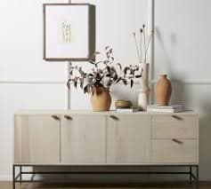 Expertly crafted of solid FSC poplar wood with iron legs and top-grain leather pulls; features 2 drawers and 2 cabinets with a removable inner shelf. Available in Dove Poplar, Auburn Poplar and Black Wash finishes. Kiln-dried poplar construction, metal glides on drawers, adjustable levelers; imported.