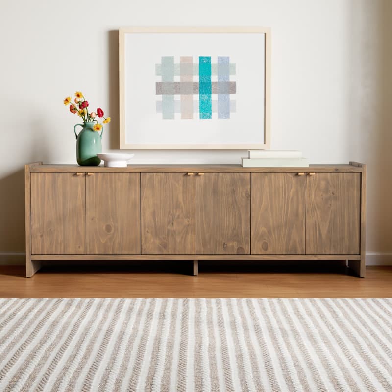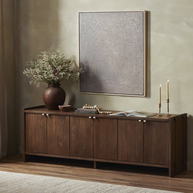Handa 78'' Media Console — solid wood media console (78" wide) available in Brown (also shown in Black Wash Poplar). Listed on Birch Lane as a living-room media console with multiple color options. (Overview and customer reviews present on the product page.)