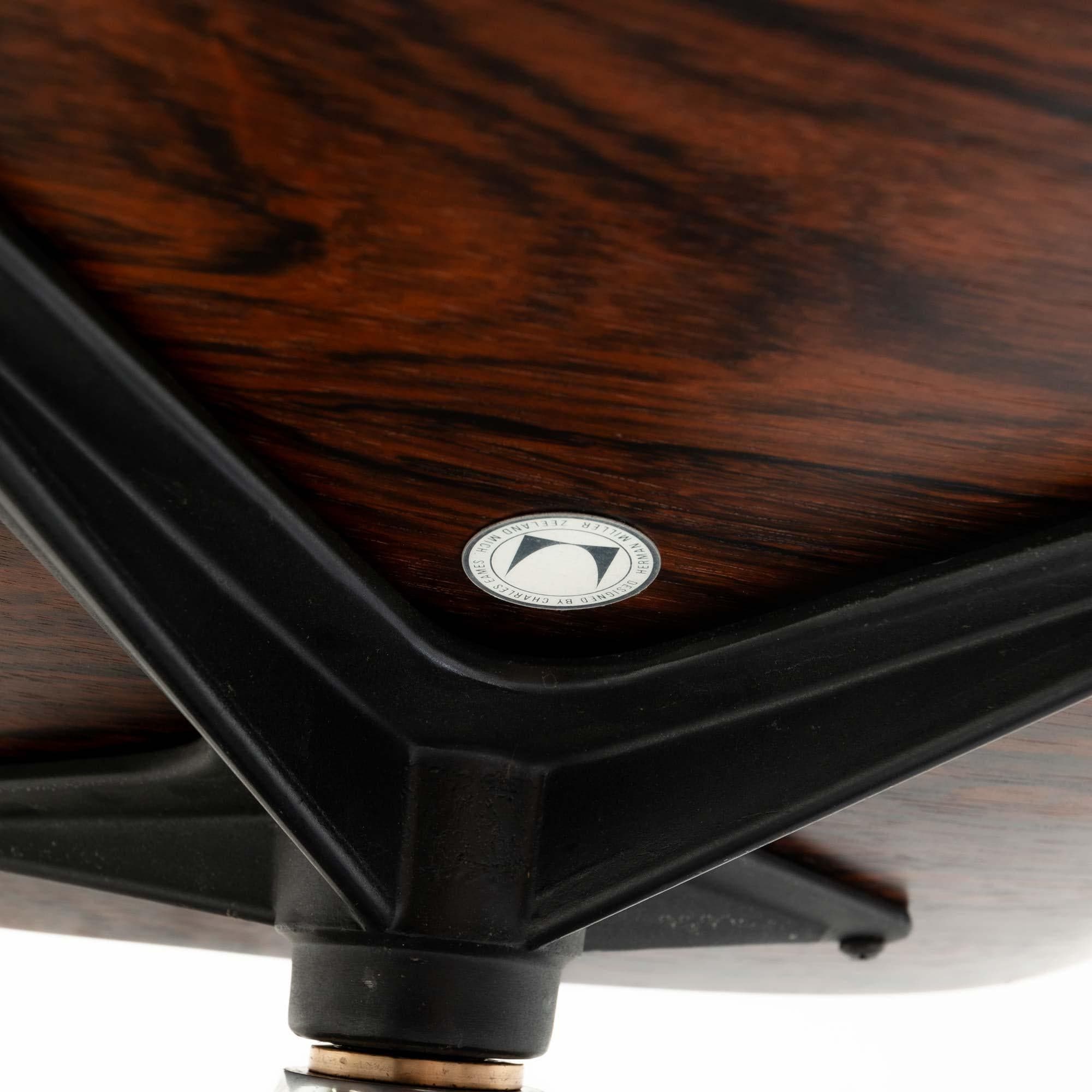 Rare and collectible 1958 Eames lounge chair with ottoman, model 670-671 includes all distinct 1st generation details, restored and reupholstered by Herman Miller. 1st gen details: 1. Three screw armrests 2. Boot glide ottoman. 3. White medallion logo (in circulation between 1956-1964) 4. Silver cushion clips at up right angle. This particular 1st generation has striking grain across all the shells, with matching production stamp number 712. Restored by Herman Miller in the 1990s with new shock mounts stamped and dated and custom ordered cushions (new foam and dacron).