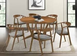 Santana 7-pc. Dining Set is beautifully crafted with splayed legs; the modern round dining table serves as an elegant focal point and plays around with the angles of wood grain to achieve a rich, eye-catching tabletop. The versatile mid-century modern set complements a variety of styles and is space-friendly for eat-in kitchens and dining rooms. The set includes 1 round dining table and 6 dining chairs. The 54" diameter tabletop comfortably seats up to 6; chairs feature a curved, hugging back and polyester upholstery.