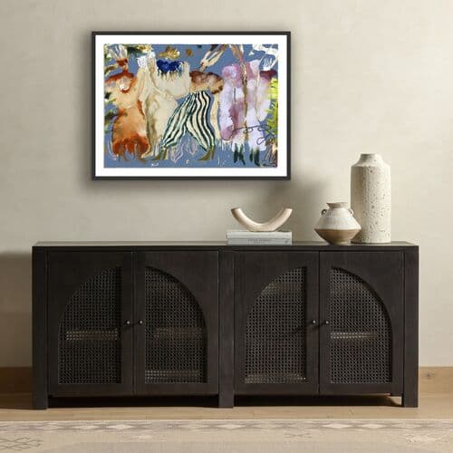 Austin figurative painter Caroline Pinney explores intimacy and human relationships in her art brut-evocative pieces. Working with a range of mediums, from oil stick and charcoal to coffee and spray paint, she often uses her own hand to manipulate materials. Printed on premium paper and float-mounted within a rustic walnut frame. Handmade in Austin, Texas.