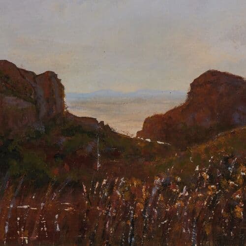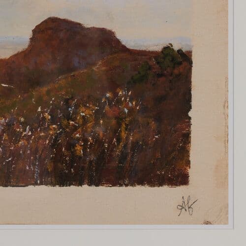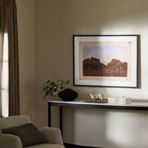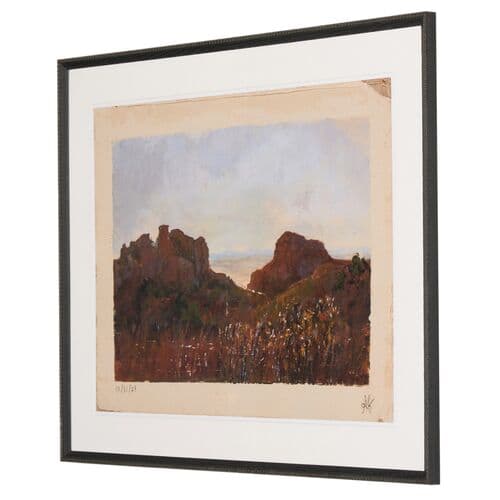Inspired by the natural terrain of Texas, Austin-based artist and registered nurse Aileen Fitzgerald paints atmospheric landscapes reminiscent of early Impressionism with a heavy emphasis on light. Finished within a decorative Brimfield black frame of naturally distressed painted pine. Handmade in Austin, Texas.