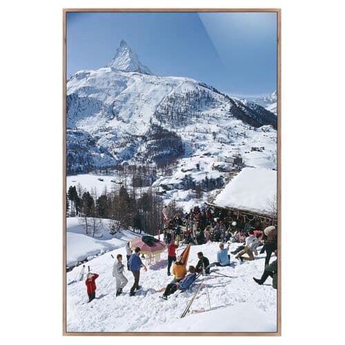 32" x 48" Zermatt Skiing II Photograph by Slim Aarons - Rustic Walnut Frame - Blue