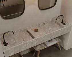 Handmade wall-mount double bathroom sink carved from natural marble (Light Emperador / Calacatta Viola and other marble options listed). Materials: Natural Stone, Marble, Travertine. Seller offers custom sizes and designs; items shipped from Türkiye via DHL Express. Returns & exchanges accepted. (Full listing contains additional photos and a product video.)