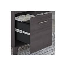 Build your ideal home office around the Bush Furniture Somerset 60"W L-shaped desk featuring transitional style and plenty of storage space for work materials. Maximize the potential of your home office with this L-shaped desk. Create your remote work headquarters with the space for a computer, phone, printer, and more on a surface that features wire management grommets for keeping cords and cables in order. A convenient pullout tray provides a perfect place to keep a keyboard or laptop, and the desk also includes a vertical storage cabinet with an adjustable shelf. Place pens, paper, and more in the box drawer, and enjoy a file drawer gliding on smooth ball bearing slides for an easy reach to documents. The desk in transitional styling offers an elegant finish with tapered legs and contemporary metal hardware. Assembled Dimensions: 29"H x 60"W x 59"D. Laminated over composite wood in a storm gray finish. Contains two drawers. Meets or exceeds ANSI/SOHO standards. American-made with US and imported parts.