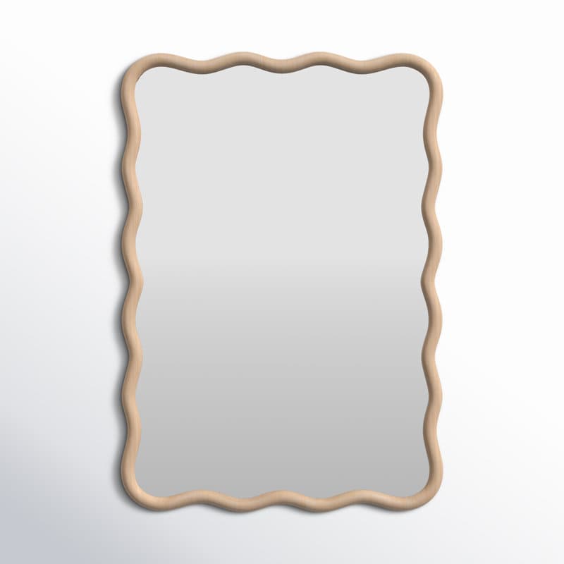 Organic, wavy/abstract accent mirror with a hand-finished frame; designed to hang vertically or horizontally. Available in multiple finishes.