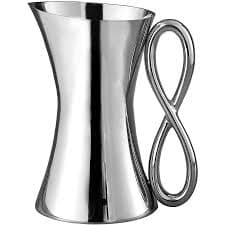 The Infinity Pitcher by Nambe upgrades the typical pitcher with sleek lines and an elegant look. The handle is formed from an elongated infinity symbol, making it easy to hold and symbolizing forever. Designed by Wei Young, this stainless steel pitcher is both decorative and functional — dishwasher safe with a 68 oz capacity. Overall size listed as 7" W x 10.5" H.