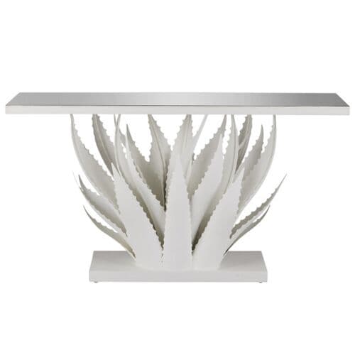 The Agave Console Table was inspired by the flourishing plant of the same name, whose spiky, leathery fronds curl up from the ground just as the oversized leaves on this console table do. “My love of the Agave plant, of which hundreds of varieties flourish in the Yucatan, has inspired me for many years, says the table’s designer Marjorie Skouras. Her passion for the Yucatan peninsula, the surroundings in which she lives and through which she translates the flora and fauna into dynamic products in her studio, shines in this wrought iron table.