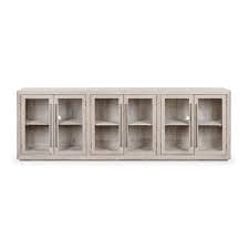 Simple yet showstopping, this sideboard flaunts the energetic grain and rich color exhibited in solid oak. Exposed joinery adds subtle flair to the look while removable shelves make a perfect home for books, games, or entertainment systems. • Oak Wood, Tempered Glass • Three adjustable shelves • Six Doors • Three Wire Management Holes • Transitional. Care instructions: Dust surfaces with a feather duster and wipe gently with a slightly damp cloth. Wipe spills immediately. Do not use silicone-based polishes, cleaners, solvents, or abrasives. Country of origin: India.