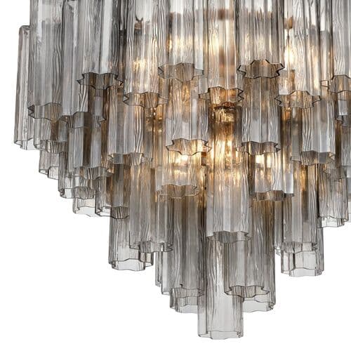 The captivating Addis Lighting Collection is a modern-day interpretation of the iconic mid-century Tronchi chandelier. Inspired by its predecessor's sleek lines and geometric shapes, the Addis features a metal frame that exudes sophistication and style. Its unique design showcases transparent tiers of textured Tronchi glass tubes, forming a mesmerizing 5-point rounded star shape. Choose from a range of glass colors, including clear, amber, smoke, and white, or the stunning Autumn option, which features a captivating multicolor disposition of amber, clear, and smoke Tronchi glass. The Addis Lighting Collection offers various sizes and finishes, allowing you to find the perfect fit for your space while adding a touch of timeless elegance.