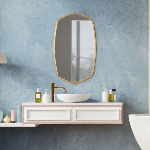 This hand forged metal mirror frame features a unique shape with delicate curves, finished in a lightly antiqued gold leaf. Mirror has a generous 1 1/4" bevel.