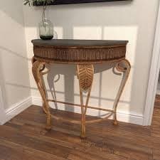 Bring a finishing touch to your home with an inviting appeal with this console table. A sturdy and long lasting construction for a years of enjoyment. Traditional console table will add timeless appeal in your rustic interior when paired with distressed wood furniture pieces and dried artificial plant. This item ships in 1 carton. Suitable for indoor use only. Some assembly required. Maximum weight limit is 100 lbs. This is a single gold colored entryway table. Modern style. Inspired by sleek elegance and clean lines, a minimalistic design offers effortless luxury with monochromatic tones and bold, angular structures. Antique gold console table is made from solid iron materials. Accent table features a metallic gold antique finish throughout with dark metal table top. Half moon shaped side table features an hourglass silhouette with scrolled legs and adorn with embossed leaves detailing throughout the gold structure, and complemented with a solid black top.