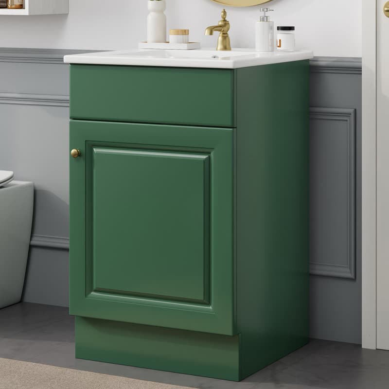 This 20" freestanding single vanity set has a sleek, streamlined design for your bathroom. It has a solid wood base that comes in a muted tone that complements a variety of styles and color palettes. On the front, a cabinet door with wooden inlays and a sleek metal handle opens up to reveal space for cleaning supplies and other toiletries. This vanity comes with a pre-drilled hole, letting you add a faucet (Not Included) of your choice over the included sink. What's Included: Cabinet Handles, Sink. Not Included: P-Trap, Mounting Bracket, Faucet, Mirror, Drain Assembly, Backsplash.