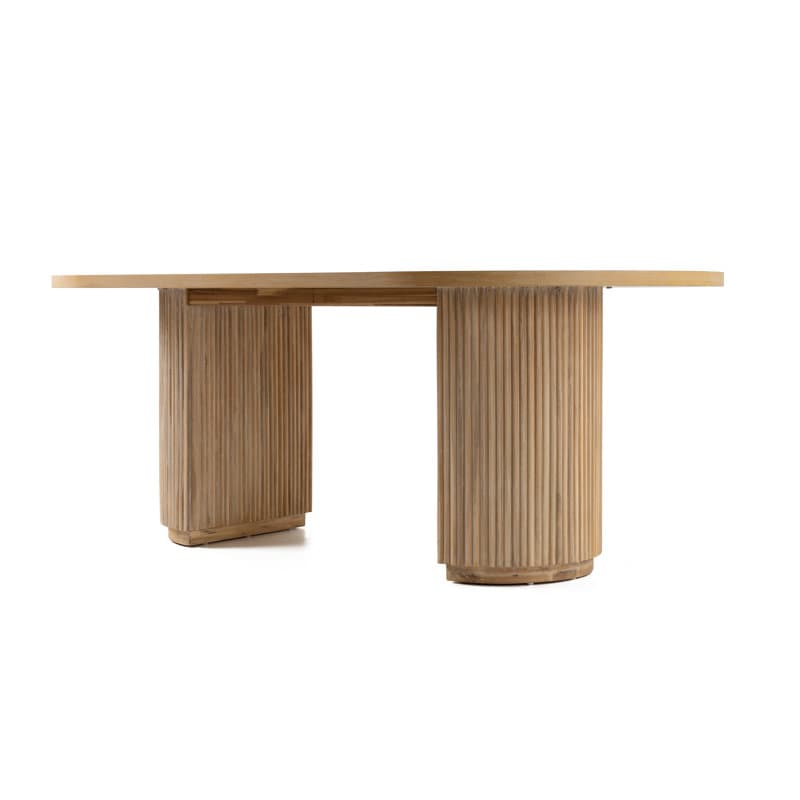 An oval acacia dining table with fluted/double-pedestal bases and a natural finish. Seats up to 6-8 depending on size; solid and manufactured wood construction; some assembly required. (Details as listed on the product page.)