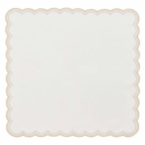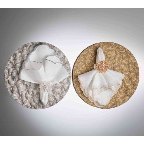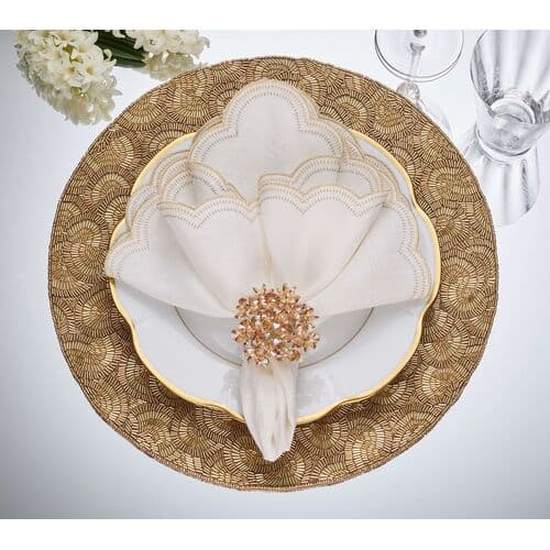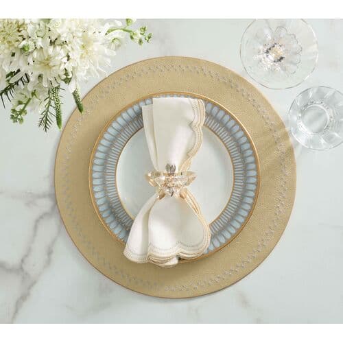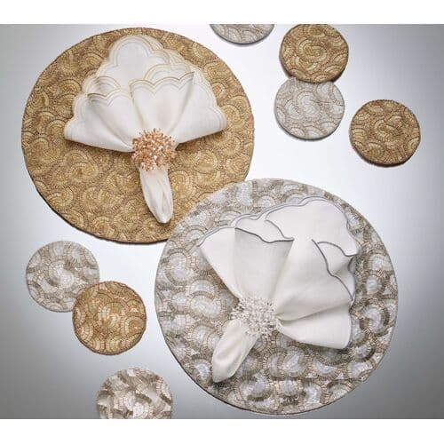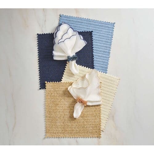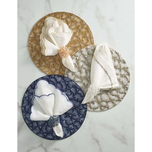 The Lune Napkin is playful with crescent swirls, echoing the curves of round tables and sculptural tabletops. Fine embroidery traces the scalloped edges in layered shades. Pair with the matching placemat and a sophisticated napkin ring to create an unforgettable table setting.