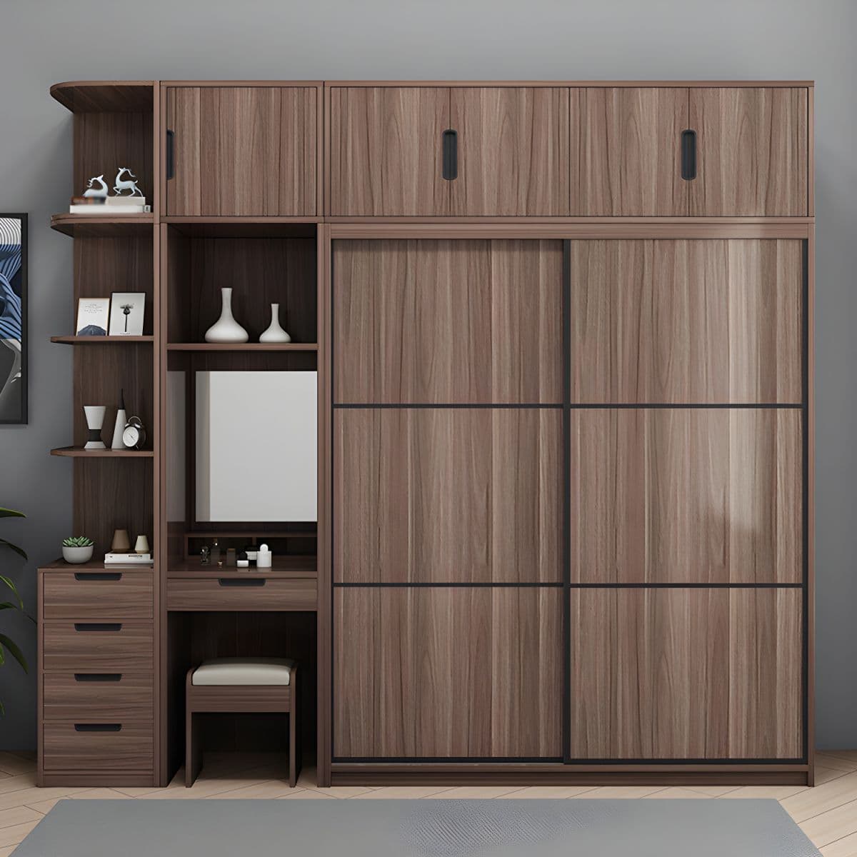 Color: Brown. Style: Modern. Product Type: Wardrobe Armoire. Material: Manufactured wood. Wood Tone: Medium wood. Features: Mirror included, sliding door mechanism, 5 shelves (non-adjustable), 3 clothing rods. Legs: without legs. Warranty: 60 days. Multiple size and object-option configurations available (armoire, armoire with side/top cabinets, wardrobe & dressing table, etc.).