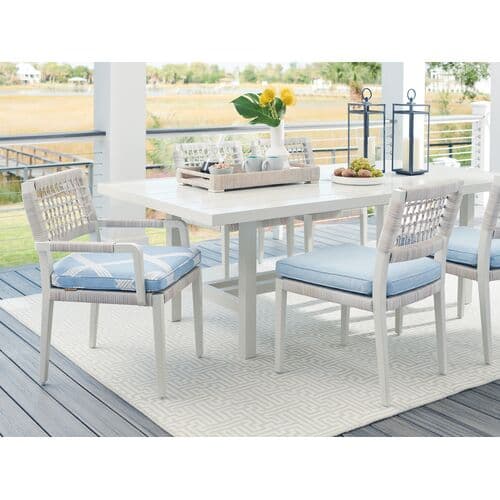 The Seabrook Dining Arm Chair is a part of a collection that redefines casual outdoor living with its breezy transitional design. Crafted with durable aluminum frames, this chair features a unique herringbone pattern of all-weather wicker. The blend of shades in the wicker allows for versatility in color palettes, making it adaptable to both cool and warm tones. Designed for larger outdoor spaces, the Seabrook collection includes a variety of pieces, offering both style and comfort for your outdoor dining experience.