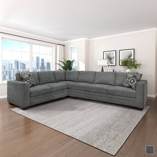 Fremont & Park - Riverdale Collection. Providing ample space to get comfortable and recharge, the Riverdale Collection’s plush seating and functional accents make this sectional the perfect addition to your home’s living room. Gray textured fabric covers the loose-back, reversible seating of the collection, while large nailhead trim defines the arm profile. Both the left and right-side segments feature an interior-side-mounted USB port for convenient charging of your electronic devices. A lift-top ottoman provides storage. Comes with two decorative throw pillows; tapered wood feet in espresso finish; seat cushions feature tufting accents. Back cushion: polyester fiber (loose & reversible). Seat construction: foam + pocket coil + dacron (attached). Weight capacity: 300 lbs per seat. Packed and shipped in two cartons. Country of origin: China. Care: Clean with dry cleaning solvent only. Assembled dimensions and other specs provided on product page.