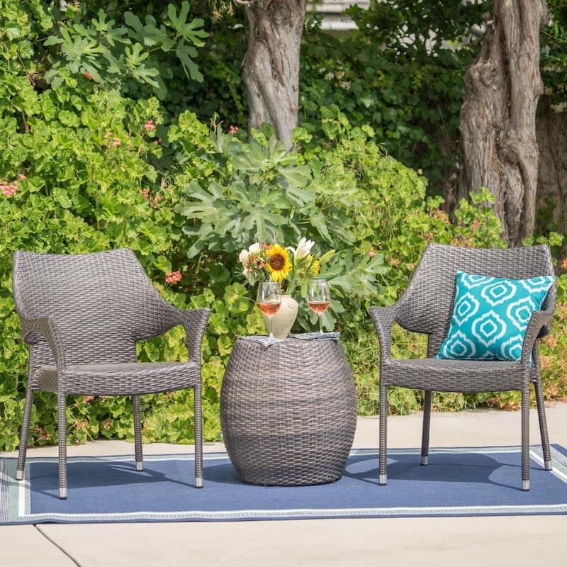 Includes: One (1) accent table and two (2) stacking chairs Material: PE Wicker, iron Wicker finish: Grey, Multibrown Assembly required: No Hand Crafted Details Table dimensions: 20 inches high x 19.25 inches wide x 19.25 inches deep Chair dimensions: 32.75 inches high x 24 inches wide x 24 inches deep Seat dimensions: 16.50 inches high x 18.50 inches wide x 18.25 inches deep Chair Type: Arm Chairs, Wicker Chairs, Chat Sets Style: Contemporary, Modern Assembly: Assembled Country of Origin: China