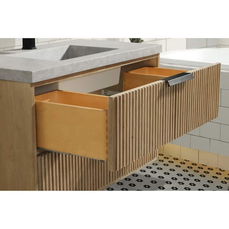 Transform your bathroom with the 36 inch San Diego single sink vanity, which will serve as the focal point of your remodel. The vanity is expertly crafted from solid wood to ensure durability for years to come. The wood is finished with raised grain to create a distressed and reclaimed appearance. The two solid wood dovetail drawers feature full extension glides, providing ample storage space for your daily toiletries. The mid century modern style is completed with a sturdy concrete countertop that complements the design of the vanity. Features: solid wood construction/frame; handcrafted and stained finish resulting in a unique finish for each piece; solid wood dovetail drawer boxes; drawers feature soft closing mechanisms and full extension glides; wood finished to prevent warping and withstand bathroom humidity; concrete countertop is a blend of eco-friendly elements and concrete for durability and reduced weight. Country of origin: Vietnam.