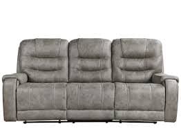 Acadia reclining sofa with dual reclining ends (manual pull tab) upholstered in a grayish-brown microfiber; contemporary styling with track arms and attached cushions. Manual reclining motion and comfortable foam/coil seating construction.