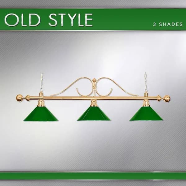 Billiard chandelier that illuminates the entire playing field on a billiard table. Features: rod color brass; shade color brass; rod length 1760 mm; shade height 250 mm; shade diameter 400 mm; shade material: metal; rod material: metal; E27 bulb fitting; includes 1.40 m chain and ceiling rose. (Price does not include light bulbs.)