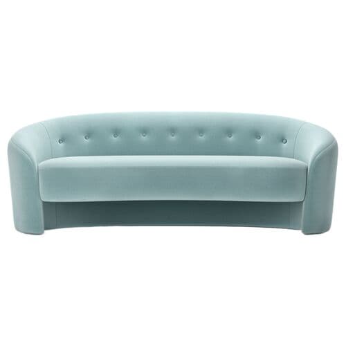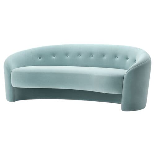 Our Button sofa features a dramatic crescent shape with a floating seat, offering a delicate balance of accessible luxury to any living space. This curved beauty can comfortably seat three people and is available in multiple sizes. We envision it fitting perfectly in a library or casual family room.