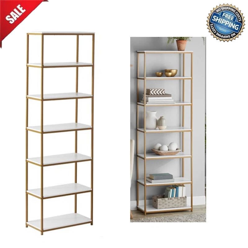 Free-standing 6-shelf bookcase with gold metal frame and white shelves. Suitable for books; unbranded; new condition. Item specifics list dimensions as 23.62" W x 11.81" D x 74.65" H, 6 shelves, rectangle shape, color: white. Located in Hong Kong; free expedited shipping. Returns: 30 days, buyer pays return shipping.