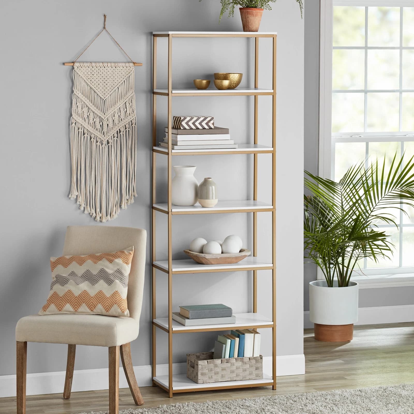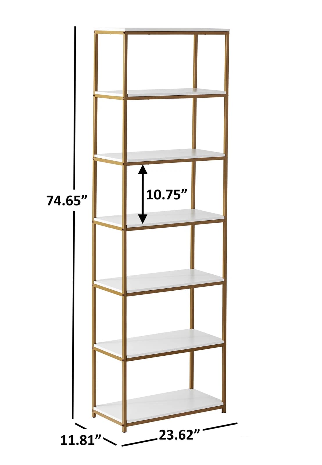 6-Shelf Gold Metal Frame White Shelves Free Standing Bookcase For Home Office