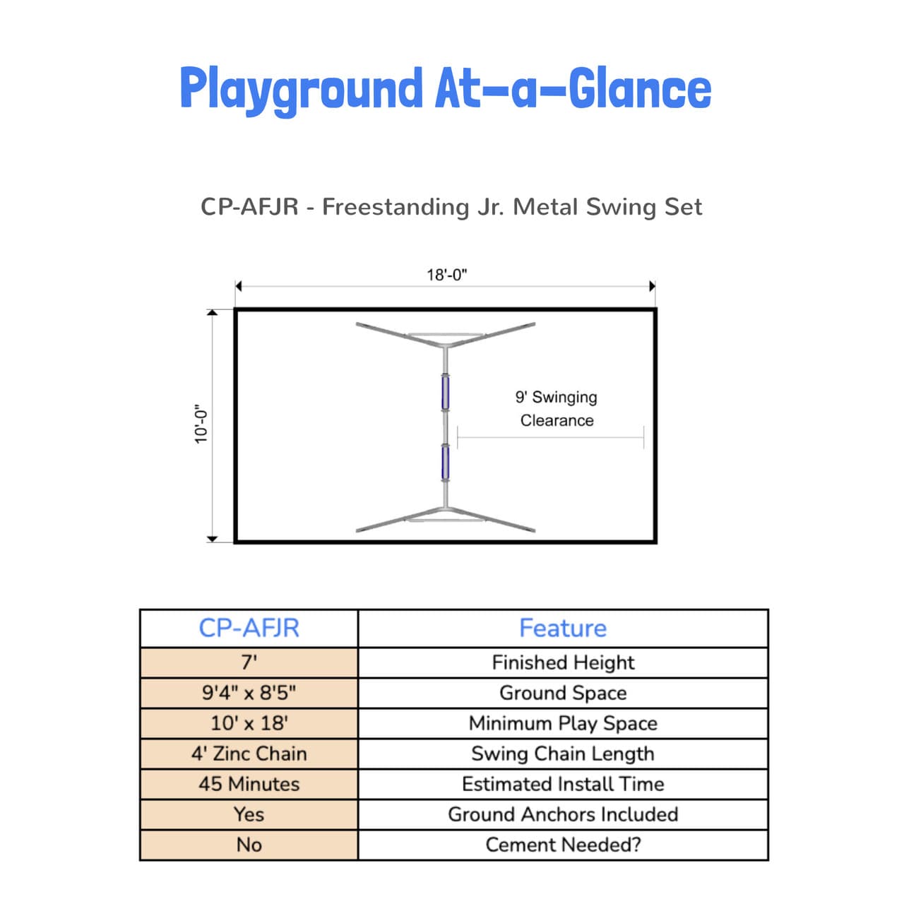 Our new Metal A-Frame Junior Swing Set is the budget-friendly option with space-saving in mind. The Junior model requires no cementing into the ground and has a smaller footprint for small backyards. Includes metal A-frame structure, 2 swing seats with hangers and chains, ground anchors, galvanized steel frame (optional powder-coating), and an illustrated instruction guide. Frame is 7 ft tall; chains are 4 ft long; designed for children under 10; each swing seat holds up to 150 lbs. Comes with a 5 year warranty. Important note: this item cannot be returned.