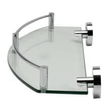 Includes one rounded clear glass shelf with chrome accents. Coated with a polished chrome finish. Expertly crafted solid brass construction for long-lasting durability. Concealed wall-mount installation. Extra-large shelf (almost 20" wide) provides storage for shower/bath items. Weight capacity ~5 lb. 1-year manufacturer warranty.