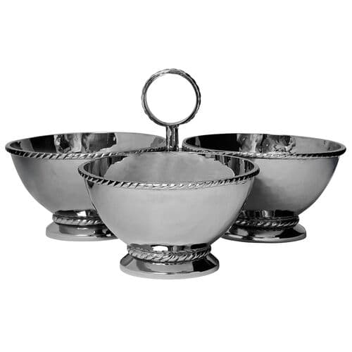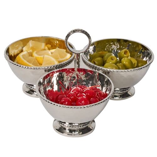 One look at this sophisticated triple bowl and visions of fireside cocktail hours come to mind (cue wistful sigh). This serving piece is handcrafted of hammered stainless steel, polished to brilliance, and trimmed with a signature thread motif. Perfect for party nibbles, cocktail garnishes, and toting out to the garden for savoring sunset drinks with loved ones. Gift boxed.