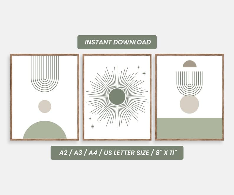 Set of 3 Mid-Century Modern Art Prints: Neutral Wall Decor, Digital Downloads, Boho Turquoise & Black Rainbow Moon and Stars Printable Art. Instant digital download — you will receive five high-quality PDF files (A2, A3, A4, US Letter, 8" x 10"). Files are for personal use only; no physical prints will be shipped.