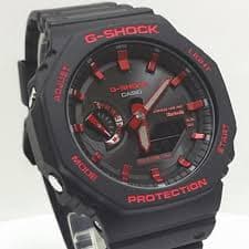 Casio G-Shock Analog-Digital GA-B2100BNR-1AJF - men's watch manufactured by Casio. Equipped with Japanese solar quartz movement (calibre 5689). Carbon / resin round case. Case dimensions: 45.4 mm diameter, 11.9 mm thickness. Dial: LCD, black with red accents. Display type: analog-digital. Mineral glass. Resin band (black). 200 m water resistance. Features include: Bluetooth, world time, luminous hands, countdown timer, backlight, perpetual calendar, date/day/month, chronograph, alarm, and power reserve indicator. Solar powered.