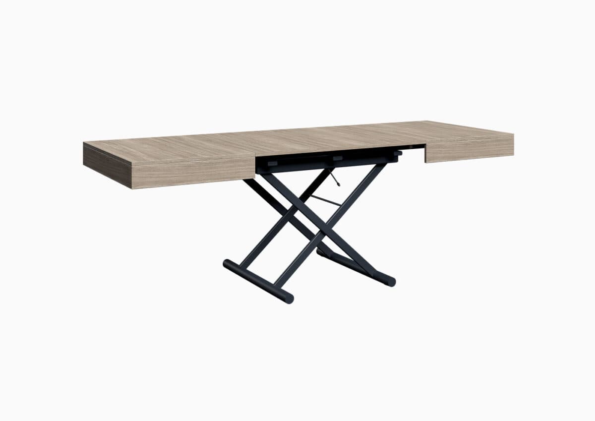 A coffee table and folding table in one piece of furniture. A table that comes in 4 different lengths — from a discreet coffee table to a full‑size extendable table. Space‑saving design with modern opening solutions and discreet wheels; laminated top panels available in multiple decors. Delivered assembled. Delivery time: 3–4 weeks.