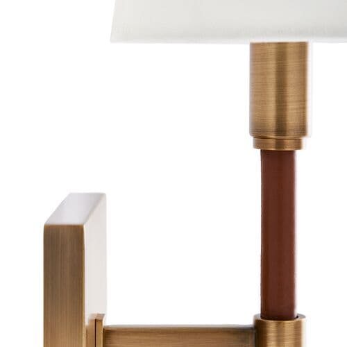In the Katie Double Sconce, leather stems elegantly contrast with metal and a white linen fabric shade, creating a timeless design that exudes sophistication. This exquisite piece is perfect for enhancing the ambiance of your bathroom, bedroom, or entryway. The harmonious blend of materials gives this fixture an equestrian flair, making it a standout addition to any space.