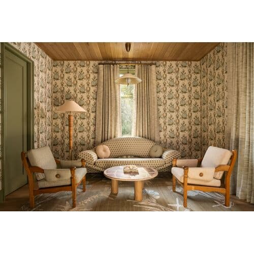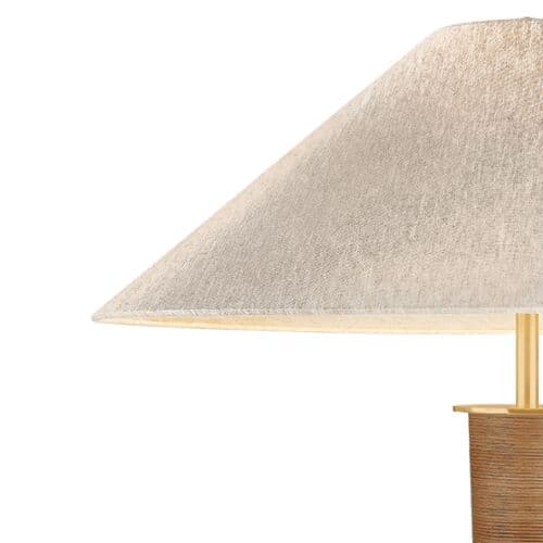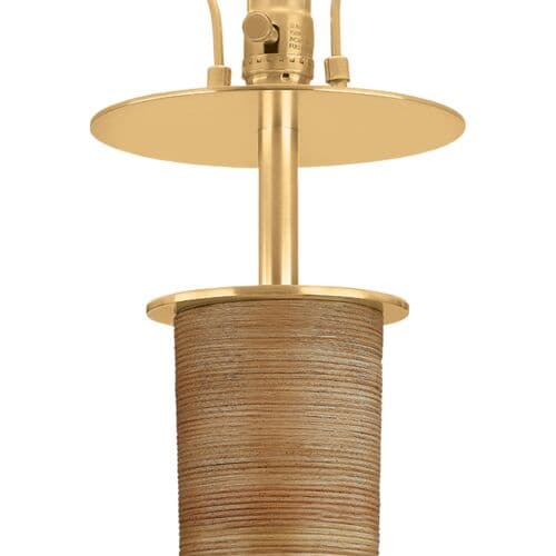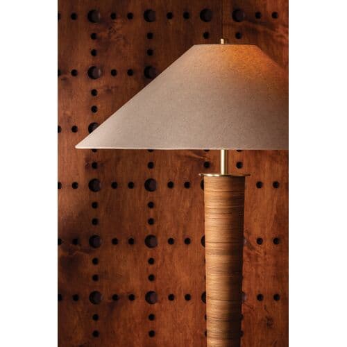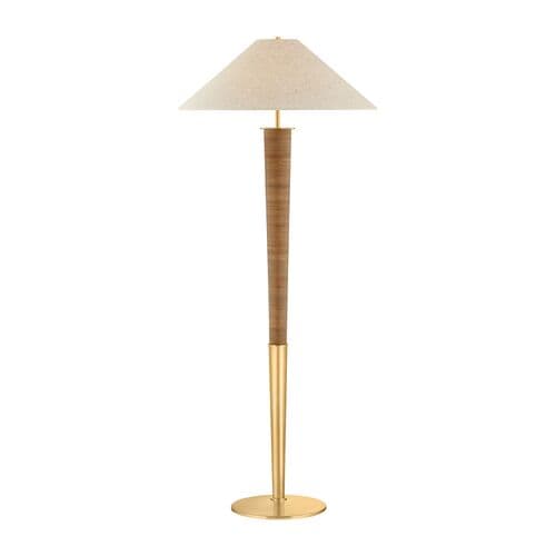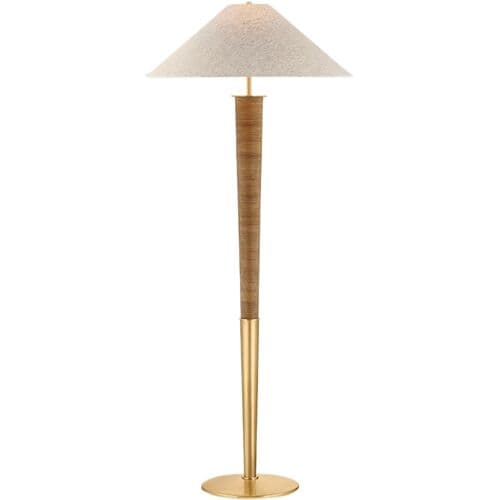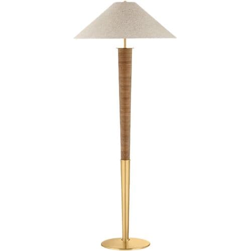 The Bohicket floor lamp makes a bold statement with its striking scale and unusual material story. An understated natural linen shade is balanced by a statement Aged Brass base wrapped in rattan. Large enough for expansive spaces, this textural lamp is still playful and versatile for use in a study, bedroom corner, or relaxed living space.