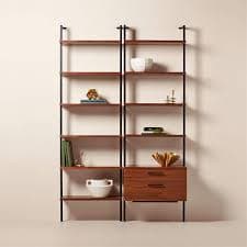 Fresh feels for a cult favorite. Six shelves in rich walnut veneer are fixed to powder‑coated metal frames and stand stacked to heights of 96". Modularly designed to save space and repeat dramatically down the wall, with a vibe that plays nicely alongside our Helix walnut desk. Stud mounting recommended; hardware included for drywall installation. Shelves: Walnut veneer over engineered wood. Frame: Black powder‑coated steel. Wall‑mounted bookcase with six shelves. Hardware included. Legs have built‑in levelers. Clean with a soft cloth; do not use abrasive cleaners. Made in Taiwan.