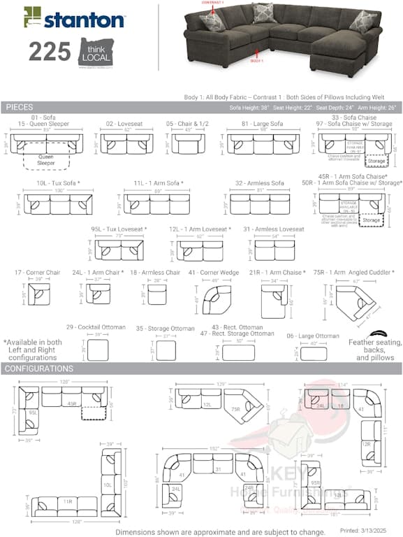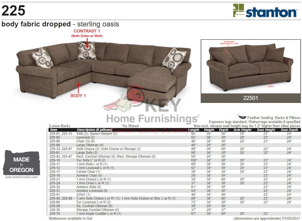 Available with down cushions, the Stanton 225 is fabulously comfortable, stylish, and versatile. Ranging from a chair and a half to a sectional, the 225 can be fully customized to fit any space. Matching ottomans can be used to complete the look using a variety of fabric and leather choices. Designed and manufactured in the Pacific Northwest, Stanton's products are renowned for their quality craftsmanship, durability, and user-friendly features. Pillows Included: 2. Arm Height: 26. Seat Depth: 24. Seat Height: 22. Features: heavy gauge sinuous springs, kiln dried 2x4 support rails, steel bolt construction with reinforced corner blocks, self-healing cushion zippers, multi-layer cushions, hand-tied edge supports, lifetime warranty on frame/cushions/filling/springs. Made in Canby, Oregon.