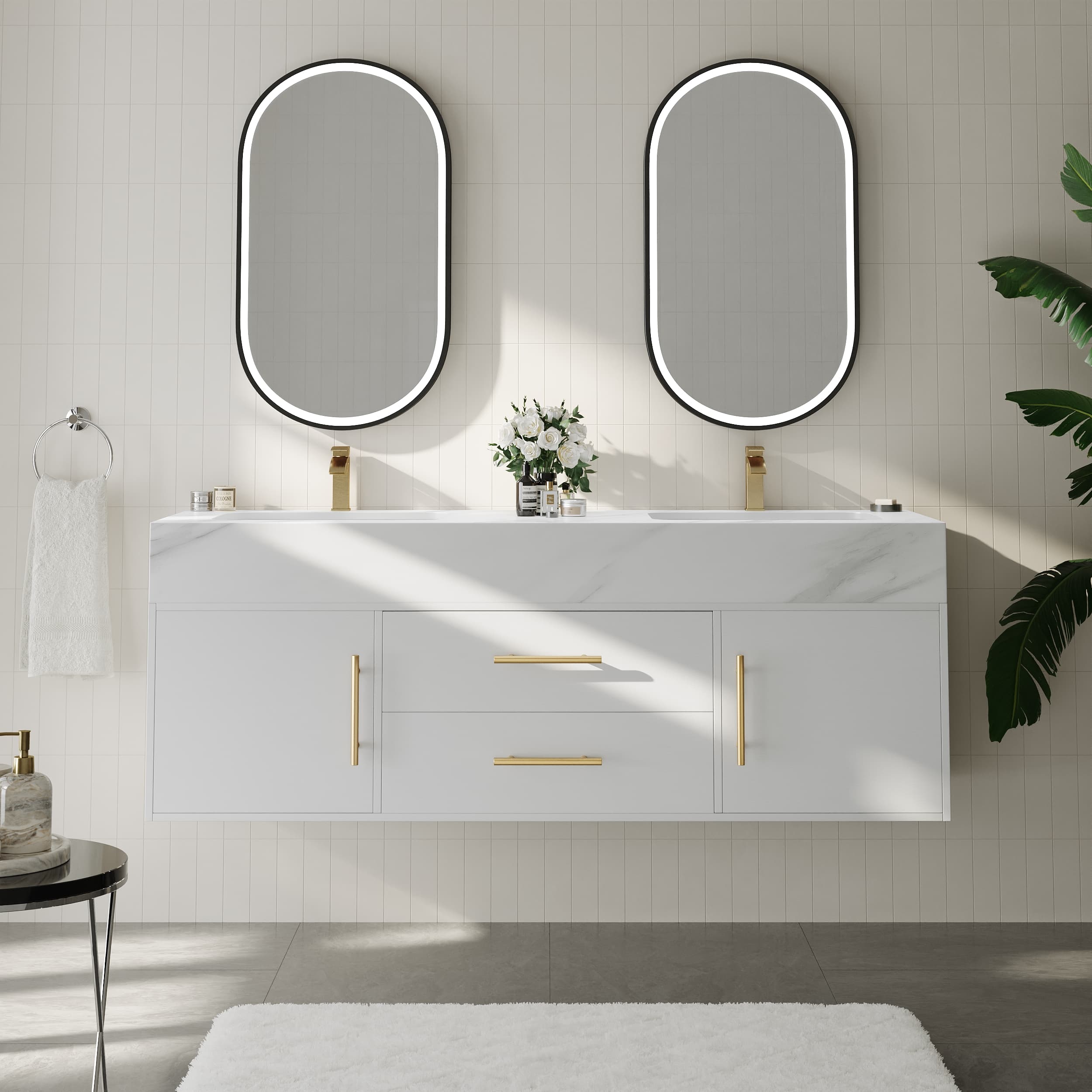 Transform your bathroom into a modern sanctuary with this 59" White Double Bathroom Vanity, designed for both elegance and functionality. The spacious dual-sink design allows two people to use the vanity simultaneously â perfect for busy mornings or shared bathrooms. Crafted with high-quality, moisture-resistant engineered wood, this vanity is built to withstand the humid bathroom environment while maintaining its sleek look for years to come. The pure white finish and clean, minimalist lines bring a sense of freshness and luxury to any bathroom décor, making it a timeless choice for contemporary homes. Dual Undermount Ceramic Sinks â Perfect for couples or shared spaces, allowing simultaneous use. Ample Storage Space â 2 large drawers + 2 side cabinets keep toiletries, towels, and cleaning products neatly organized. Modern Minimalist Aesthetic â Elegant white finish with clean lines complements any bathroom décor for a bright, luxurious look. Durable Sintered Stone Countertop â High-performance surface that is waterproof, heat-resistant, scratch-resistant, and easy to maintain. Floating Wall-Mounted Design â Creates a spacious, modern aesthetic while making floor cleaning easy. Luxury Gold Handles â Brushed metallic hardware enhances sophistication and durability.