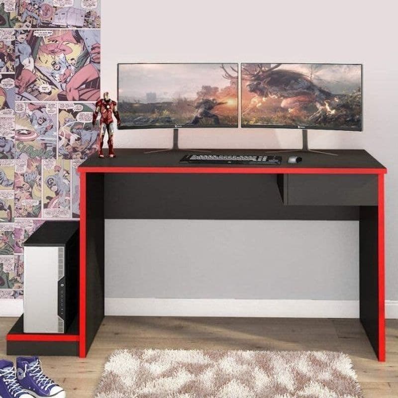 Mesa gamer/escrivaninha para computador com 1 gaveta, suporte para CPU ajustável (elevado), acabamento em MDP (finish foil). Projeto no estilo gamer com detalhes em vermelho sobre fundo grafite; indicada para acomodar monitores e acessórios, exige montagem. (Informação extraída de listagens do mesmo modelo em varejistas.)
