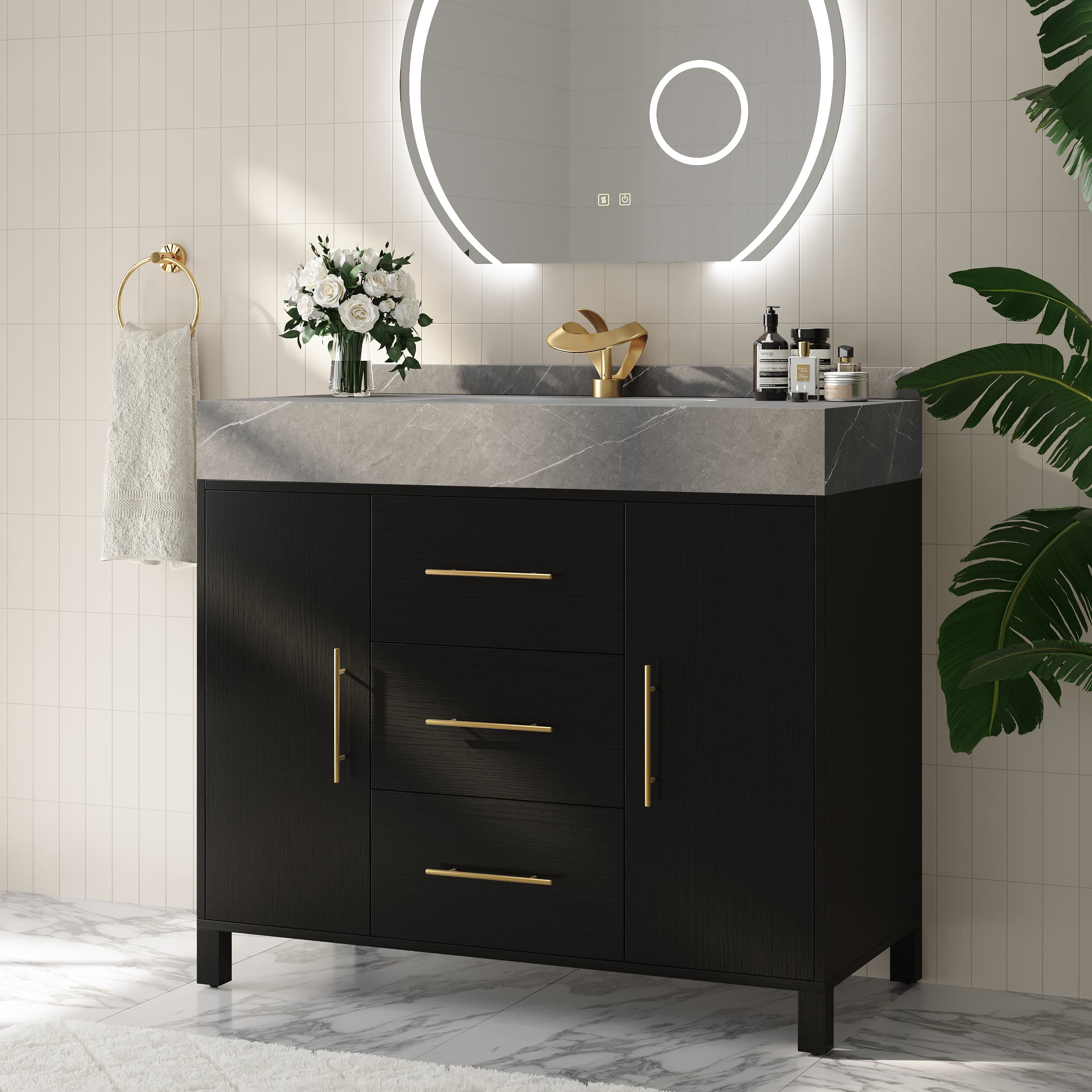 Transform your bathroom with this eye-catching 39.4" freestanding vanity, designed to balance industrial texture with luxurious metallic detailing. The cabinet features a rich matte-black finish that brings modern depth and sophistication to your space, while the concrete grey sintered stone countertop introduces a raw, architectural surface reminiscent of contemporary urban design. What truly elevates this piece is the brushed gold hardware, adding a touch of elegance and warmth to the cool, industrial palette. The interplay of matte black, concrete grey, and gold creates a unique high-end aesthetic that feels both bold and refined. Built with durability in mind, the engineered-wood cabinet is moisture-resistant and structurally stable, ideal for everyday bathroom environments. The sintered stone countertop provides premium performance with outstanding resistance to stains, scratches, heat, and water. With two soft-close cabinet doors and three soft-close drawers, the vanity offers ample space to neatly store toiletries, grooming tools, and bathroom essentials. Whether upgrading a modern home or furnishing a designer loft, this vanity combines durability, elegance, and practical storage in a statement-making design. Premium Sintered Stone Countertop: Resistant to scratches, stains, heat, and moistureâperfect for busy, high-humidity bathrooms. Durable Engineered-Wood Cabinet Body: Made from high-quality engineered wood for structural stability, long-lasting strength, and improved moisture resistance. Striking Matte-Black Cabinet Finish: Deep black tones bring a bold, modern aesthetic that complements both industrial and luxury interior styles. Luxurious Brushed Gold Hardware: Warm gold handles add a touch of opulence and create a stunning contrast against the matte-black cabinet. Optimal Storage Layout: Features 2 doors and 3 soft-close drawers, offering versatile storage for hair tools, skincare, towels, and other necessities. Modern Minimalist Style: Clean lines, balanced proportions, and elegant materials make it suitable for contemporary, Scandinavian, or luxury-modern interiors.