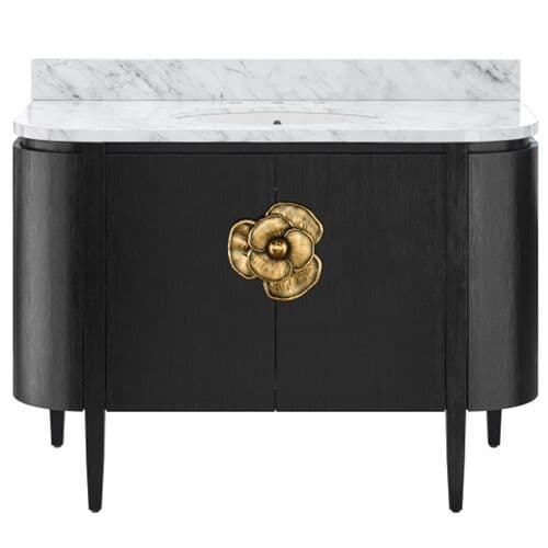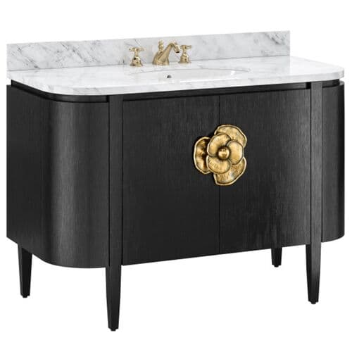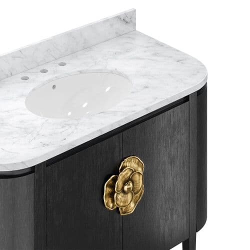 The Briallen Vanity collection offers a range of sizes and finishes, each featuring a stunning flower pull that serves as a striking ornamentation. The interior of each vanity includes an adjustable shelf and optional wood trays for flexible storage solutions. Topped with a white Carrara marble surface, each vanity is fitted with an oval undermount sink. Additional design elements include soft-close door hinges and a matching marble backsplash, ensuring both functionality and elegance in any bathroom setting.